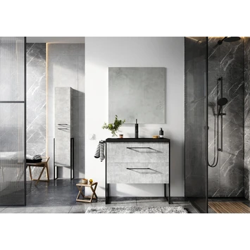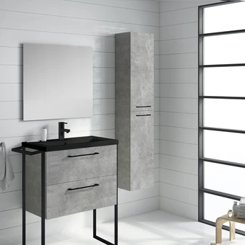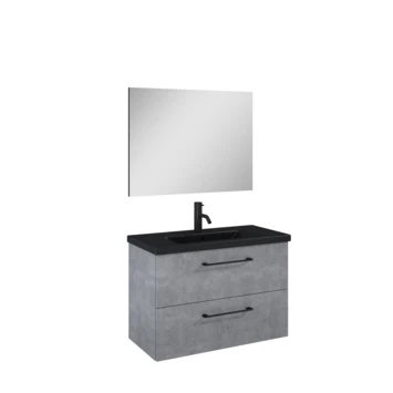 De Atlantic badmeubelset Sienna met spiegel en zwarte wastafel 80cm beton is een hangende set met een chique uitstraling. Dankzij het hangende design creëer je een ruimtelijke look in jouw badkamer. Het meubel is voorzien van 2 soft close laden en een mat zwarte keramische wastafel. Daarnaast is aan deze set een losse spiegel toegevoegd. De set is voorzien van stijlvolle zwarte grepen, wat zorgt voor een chique en industrieel uiterlijk. De set wordt flatpacked geleverd en is eenvoudig te installeren met de meegeleverde bevestigingsmaterialen. Exclusief wastafelkraan.ngsmaterialen. Exclusief wastafelkraan.