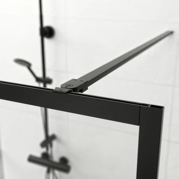 De inloopdouche A3 Contour Zwart 118x200cm heeft een minimalistisch kader wat afgewerkt is in matzwart. De douchewand heeft 6mm dik veiligheidsglas en is voorzien van een antikalk laag. Dankzij deze laag blijft het glas nog langer mooi helder. De inloopdouche wordt geplaatst met een stabilisatiesteun van 1 meter. De steun is tot de gewenste lengte in te korten en ook in een hoek te monteren. Hierdoor past de Inloopdouche A3 Contour Zwart 118x200cm in bijna iedere badkamer.