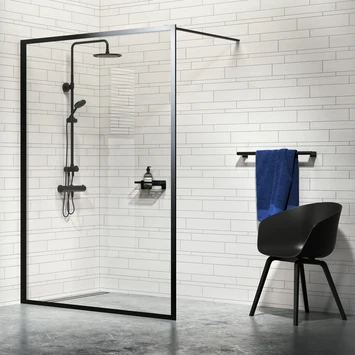 De inloopdouche A3 Contour Zwart 98x200cm heeft een minimalistisch kader wat afgewerkt is in matzwart. De douchewand heeft 6mm dik veiligheidsglas en is voorzien van een antikalk laag. Dankzij deze laag blijft het glas nog langer mooi helder. De inloopdouche wordt geplaatst met een stabilisatiesteun van 1 meter. De steun is tot de gewenste lengte in te korten en ook in een hoek te monteren. Hierdoor past de Inloopdouche A3 Contour Zwart 98x200cm in bijna iedere badkamer.
