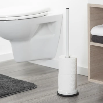 De Sealskin Reserverolhouder Acero Wit is gemaakt van roestvrij staal wat een hoogwaardige kwaliteit is. De reserverolhouder kun je daardoor naast het toilet ook prima gebruiken in vochtige ruimtes, zoals je badkamer. De vrijstaande reserverolstandaard van 52,1 cm hoog heeft een rubberen onderrand die ervoor zorgt dat de houder stabiel op zijn plek blijft staan en er geen krassen op je vloer komen. Met de witte afwerking past de standaard in ieder interieur. In de lijn Acero kun je ook bijpassende accessoires kopen bij Gamma.