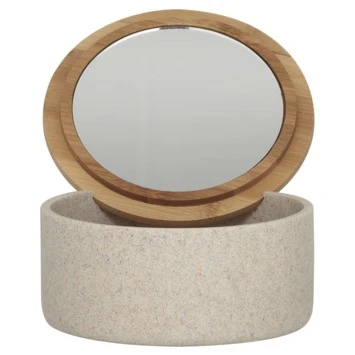 Dit spiegeldoosje is een prachtig vormgegeven opbergbakje met een spiegel in de deksel. In de deksel zitten 2 gleuven waardoor de spiegel vast te zetten is in de rand van de doos. Het spiegeldoosje is onderdeel van de Sealskin Grace serie. Ben je op zoek naar een complete set met een natuurlijke uitstraling? Begin dan met het Sealskin Spiegeldoosje Grace Zand.
