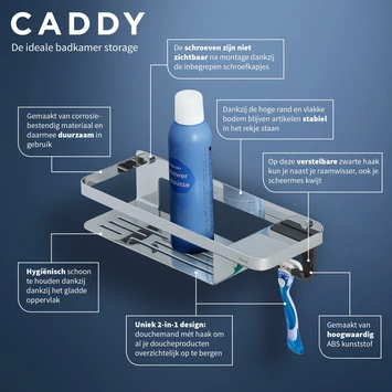 Tijdloos, uniek én multifunctioneel. Dat omschrijft het ontwerp van deze speelse douchemand mét haak van Tiger Caddy. Dit 2-in-1 design biedt naast je douchegel en shampoo ook ruimte voor je scheermes, handdoek of wisser. Zo kun je alles netjes opbergen en heb je altijd je spulletjes binnen handbereik. In de douche, bij de wastafel of in de toiletruimte. Met Caddy ga je niet alleen voor functioneel maar ook voor een luxe uitstraling.