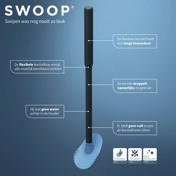 Een fris en modern gevoel in toilet of badkamer dankzij de zwarte wc-borstelhouder van Tiger Tess. Deze vrijstaande houder is voorzien van de nieuwe Swoop® flexibele toiletborstel. Met deze innovatieve borstelkop reinig je met gemak moeilijk bereikbare plekken en dankzij de vorm en het speciale materiaal van de borstel blijft er geen viezigheid achter en druppelt hij nauwelijks na als je hem terug in de houder plaatst. Draai de houder om en de borstel is niet langer meer in het zicht. Tiger Tess is innovatief en eigentijds met de herkenbare kwaliteit van Tiger.
